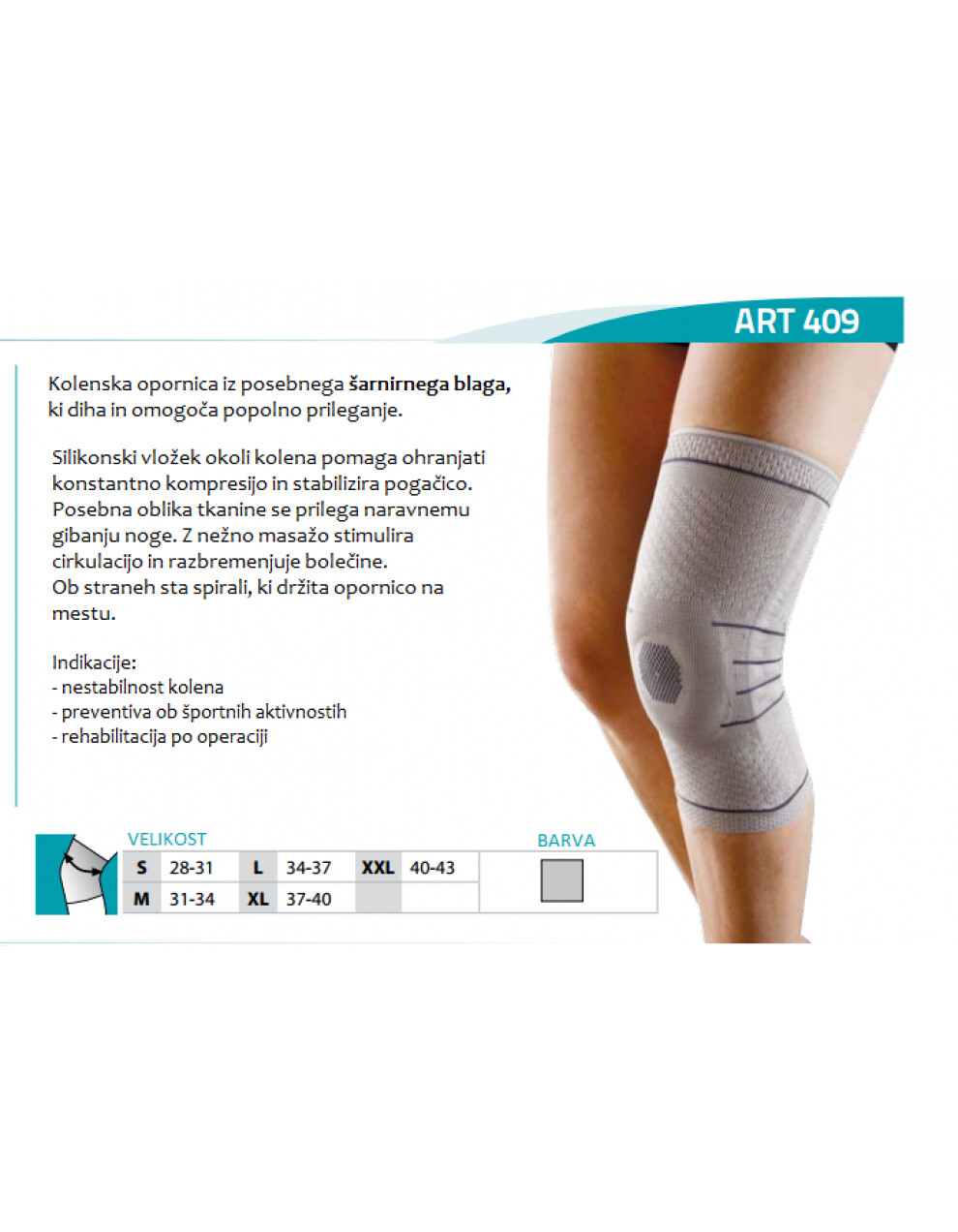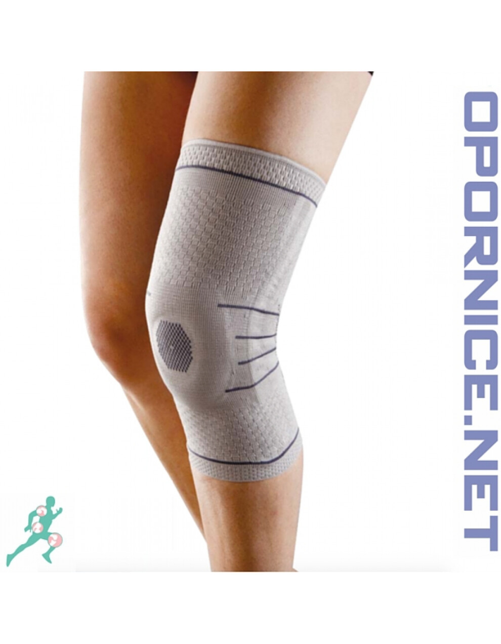 Silikonski vložek okoli kolena pomaga ohranjati konstantno kompresijo in stabilizira pogačico. Ob straneh sta spiralna stabilizatorja, ki nudita še dodatno oporo kolenu in držita opornico na mestu. Posebna oblika tkanine se prilega naravnemu gibanju noge in je brez šivov. Z nežno masažo stimulira cirkulacijo in razbremenjuje bolečine.