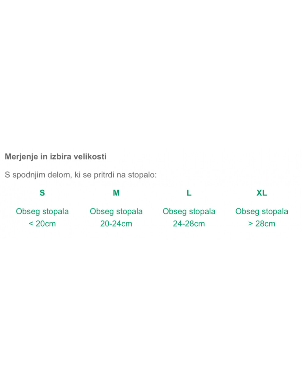 Navodila za namestitev- Namestitev lahko izvede le strokovno uposobljena oseba. Prvi del se namesti okoli gležnja, drugi del ali med vezalke ali okoli stopala. Za pravilno izbiro velikosti si izmerite obseg gležnja.