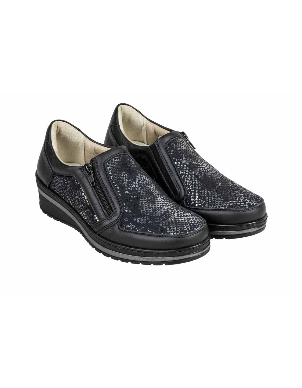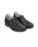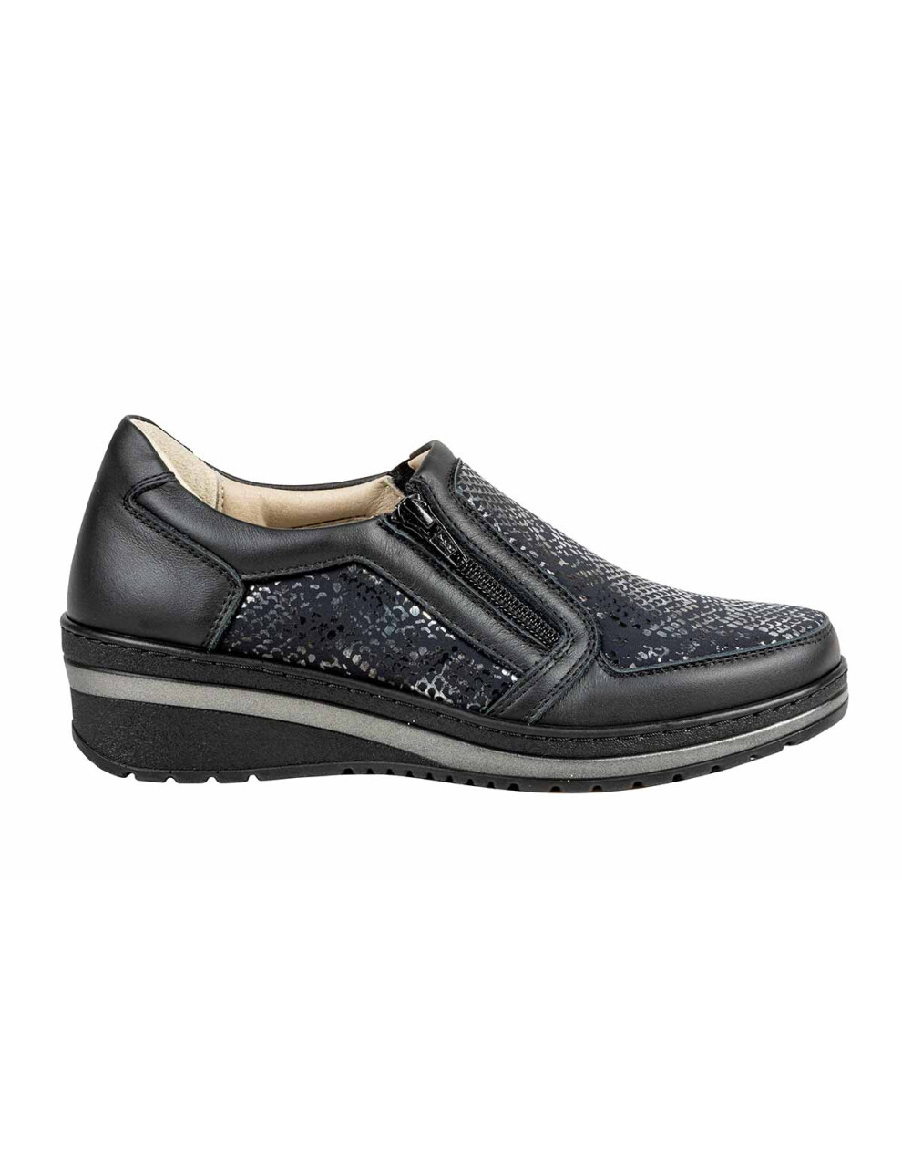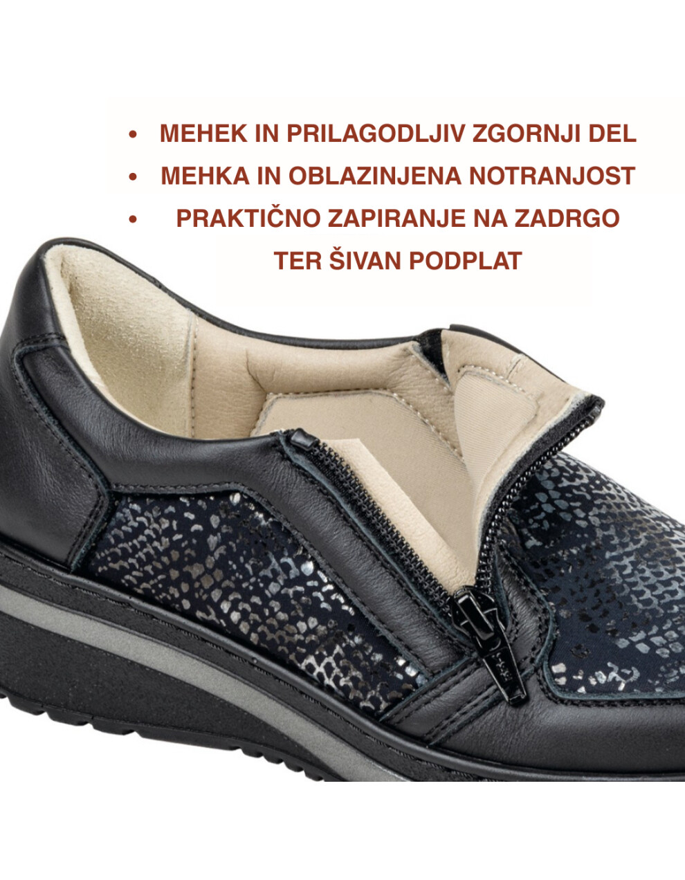 Elegantna obutev Tecnica Horizon Jesolo je primerna za osebe, ki imajo težave s stopali, kot so hallux valgus, kladivasti prsti, revmatična stopala in druge bolezni. Obutev nima izrazitih notranjih šivov, zaradi česar je izjemno udobna in primerna za občutljiva, visoka in široka stopala. Zapira se z zadrgo, kar vam omogoča enostavno obuvanje. Obutev je izjemno mehka in prilagodljiva. Narejena je iz microfibre ter usnja. Šivan in nedrseč podplat z možnostjo odstranitve vložka.