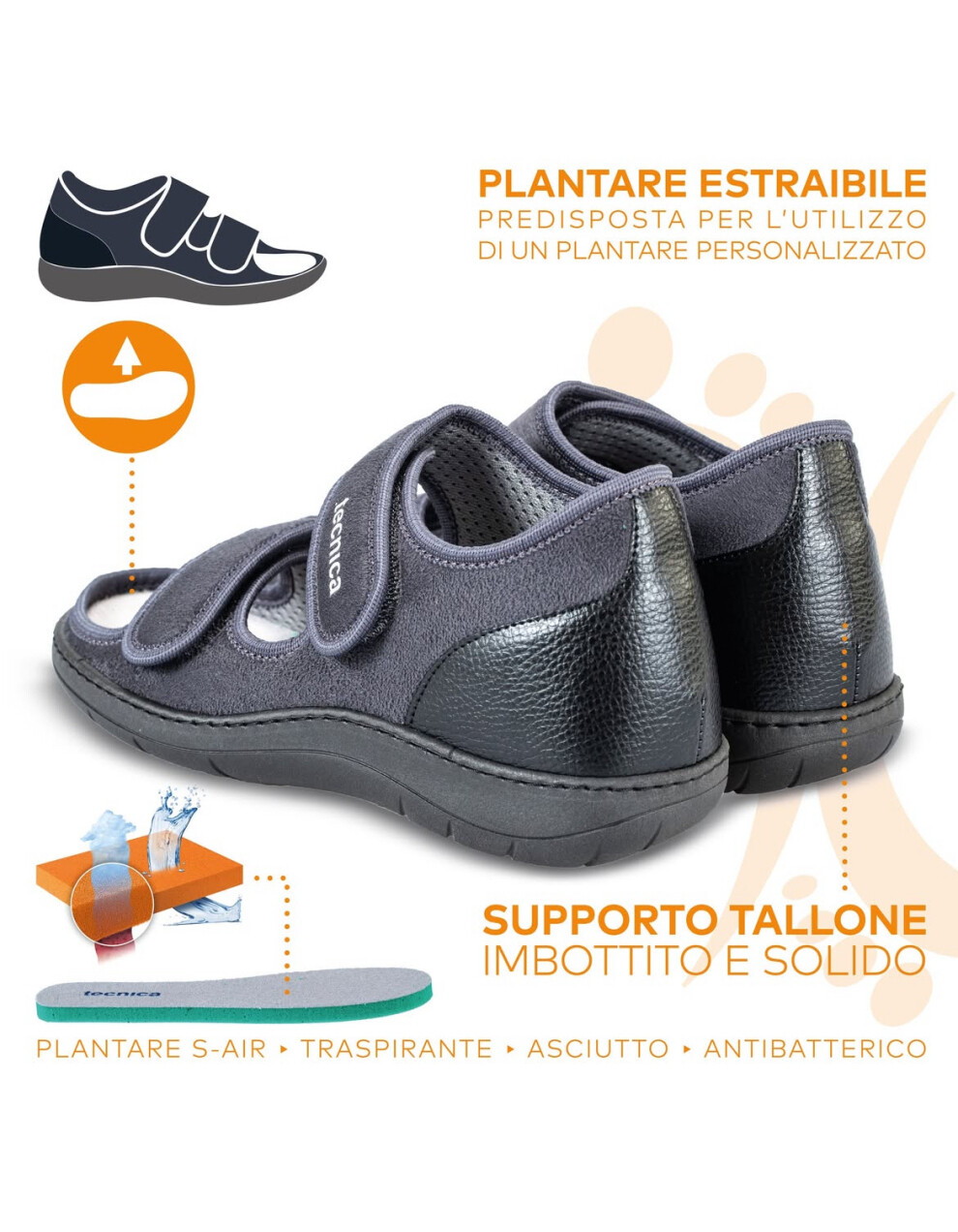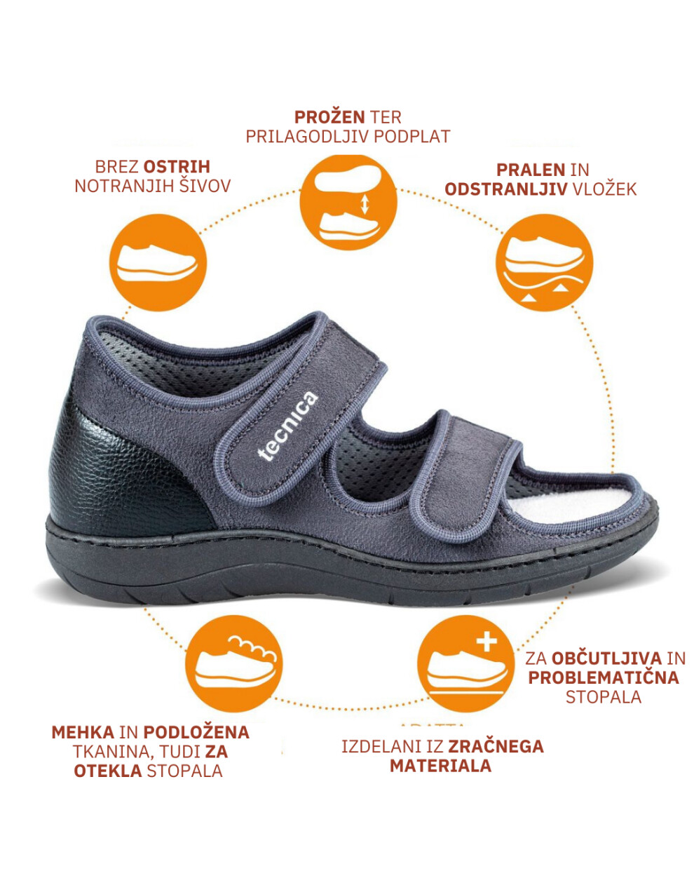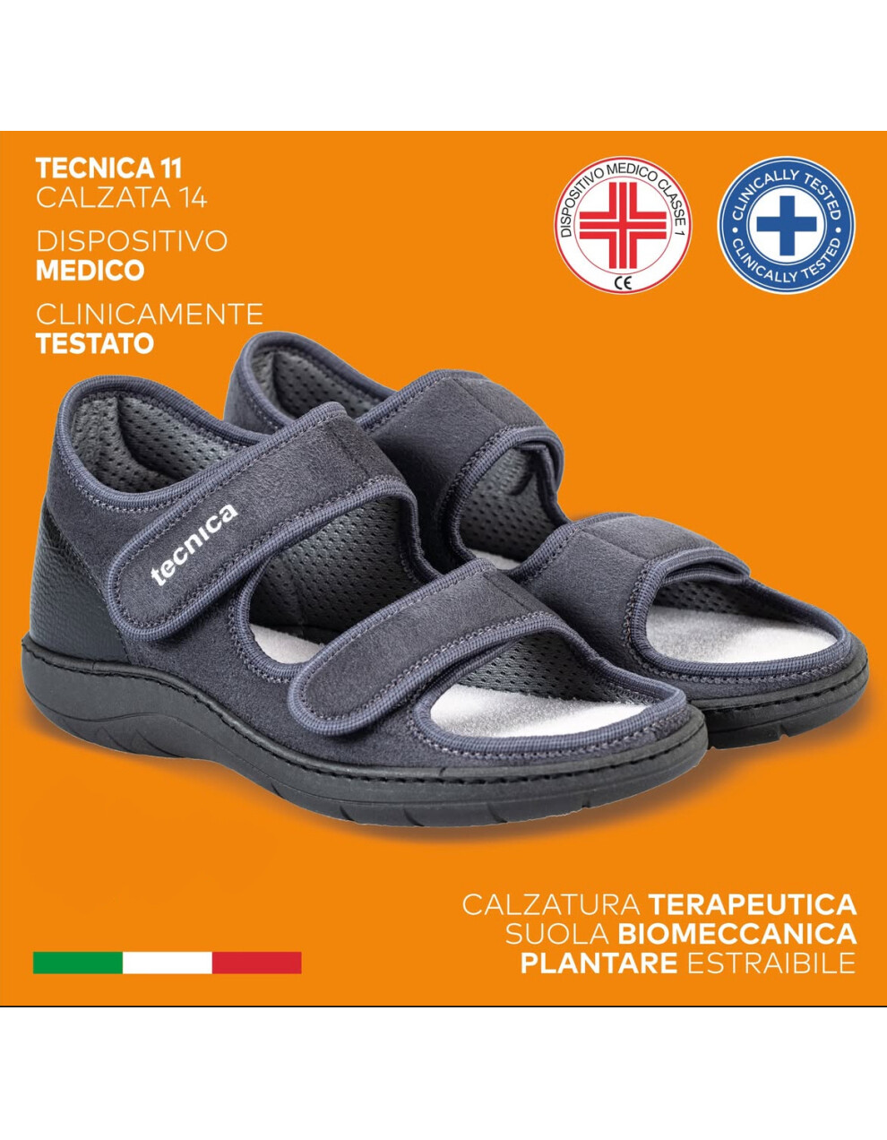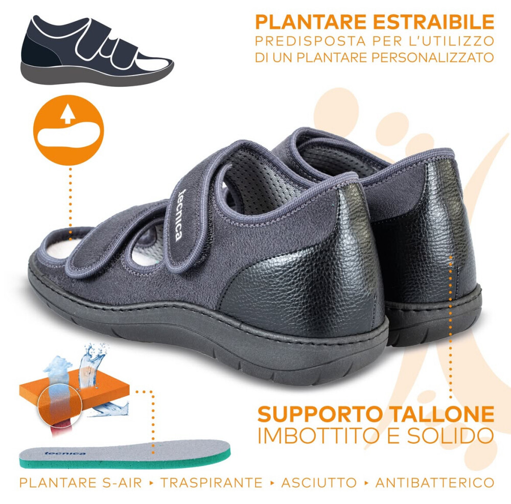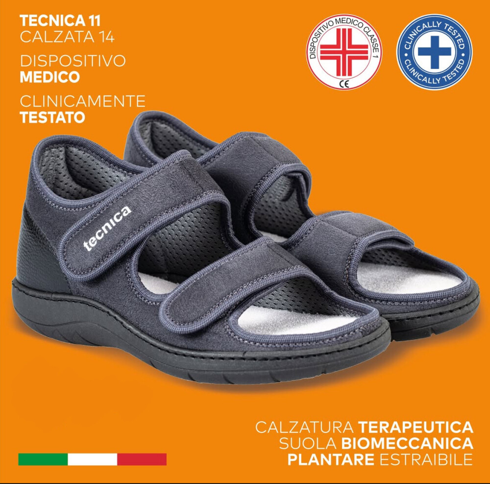 Tecnica 11 je primerno obuvalo za mlajše in starejše. Obutev je izjemno mehka, lahka in stabilna. Lahko jih nosite tudi s povoji na nogah med daljšimi obdobji celjenja, da zmanjšate obremenitev med hojo. Namenjen so vsem z občutljivimi stopali. So izjemno mehki, stabilni in lahki. Obutev z odprtimi prsti, je še posebej primerna za deformacije v predelu prednjega dela stopala. Dva velcro trakova omogočata enostavno regulacijo in lažjo namestitev obuvala. Trakovi so mehki, narejeni iz mikrovlaken in lepo fiksirajo stopalo. Odpirajo in zapirajo se na ježka lahko tudi z eno roko. Peta je ojačana iz notranje in zunanje strani kar pomeni, da nudijo še dodatno stabilnost in udobje. Možnost vstavitve peronealne opornice. Primerni so za vse, ki želite svojim stopalom le najboljše.