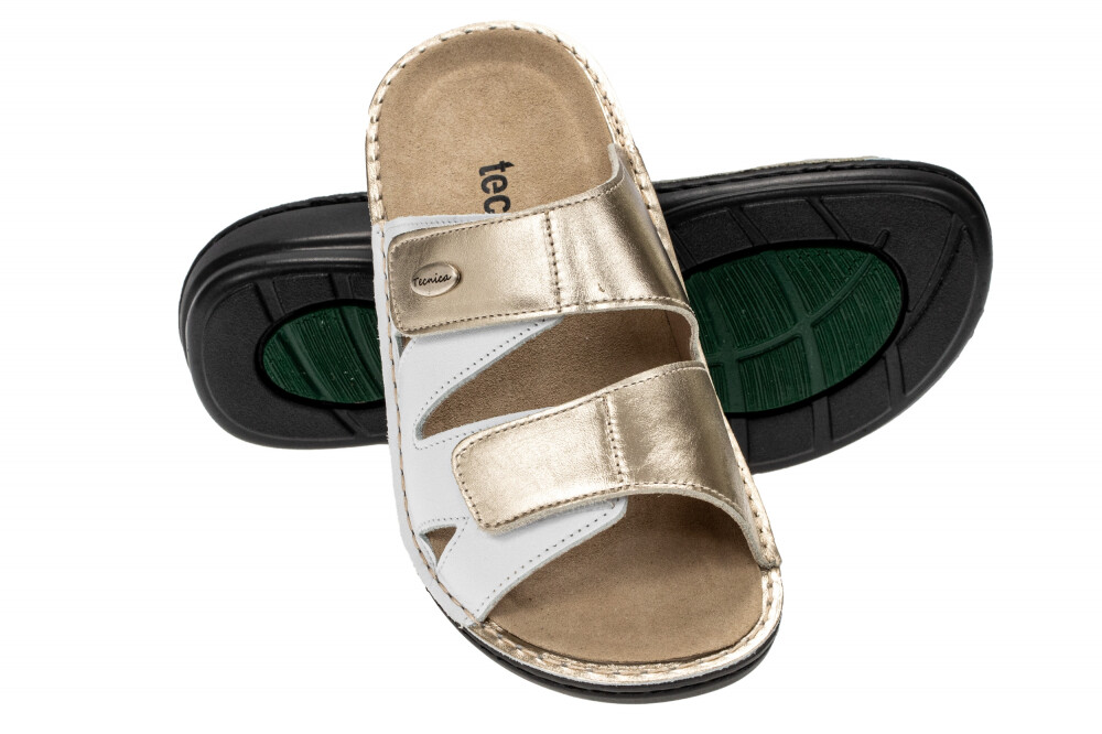 Udoben natikač Simona platino/bianco osnovan iz linije Comfort je narejen iz vrhunskih materialov. Na podlagi izkušenj strokovnjakov je izdelan natančno, pozornost je usmerjena na detajle, zato so vsi modeli zasnovani ob popolnem upoštevanju anatomije stopala in imajo anatomski vložek, ki zagotavlja idealno oporo in mehkobo. Natikači so odlični in udobni tudi za vsakodnevno nošenje, za pogosto stoječe delo ali za daljše sprehode. Zapirajo se z dvema ježkoma.