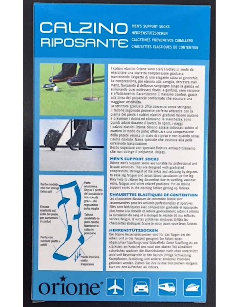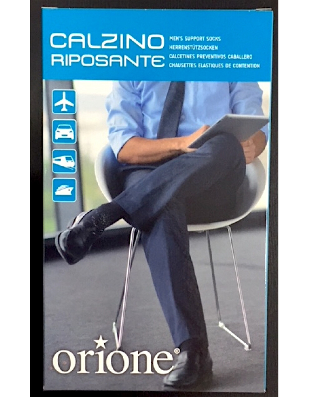 Preventivne kompresijske nogavice za moške in ženske ORIONE so izdelane iz posebnega materiala, ki zelo dobro diha, imajo nedrseč zgornji rob, ki preprečuje zdrs (nogavice ne drsijo) in obenem ne stiska stegna. Nogavice so zelo elegantne. Izdelane so iz bombaža, elastana, poliamida in so izredno kvalitetne nogavice. Ojačan imajo petni ter prstni del. Zaupa jim že ogromno zadovoljnjih strank, ker pomagajo preprečevati bolečine in občutek utrujenih nog ter spodbujajo krvni obtok. Zelo elegantna in "fina" tkanina v črni ali marin modri barvi, primerna tudi za bolj elegantno obutev (moško in žensko). Nogavice imajo kompresijsko stopnjo od 18-20 mmHg. Narejeno v Italiji.
